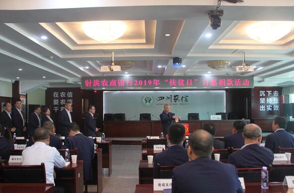 自愿捐赠,奉献爱心。10月16日,射洪农商银行在总行十二楼会议室开展2019年“扶贫日”捐款活动,全行干部员工积极参与,走到捐款箱前纷纷慷慨解囊,用实际行动支持和帮助贫困群众。此次捐款定向用于我行联系点武安镇店子村(原陈古镇泉水村)的基础设施改善。