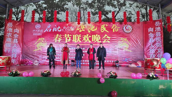 1月10日晚,由民俗文化协会主办、岳池农商银行冠名的“岳池民俗春节联欢晚会”在岳池天下第一庄成功举办。岳池农商银行副行长金小琳代表岳池农商银行向现场观众送去新年祝福。晚会表演了舞狮、太极拳、旗袍秀、小品、舞蹈、歌唱等大家喜闻见乐的节目,现场掌声不断。晚会期间,该行工作人员向现场观众发放宣传折页200余份,宣传了金融知识、金融产品。