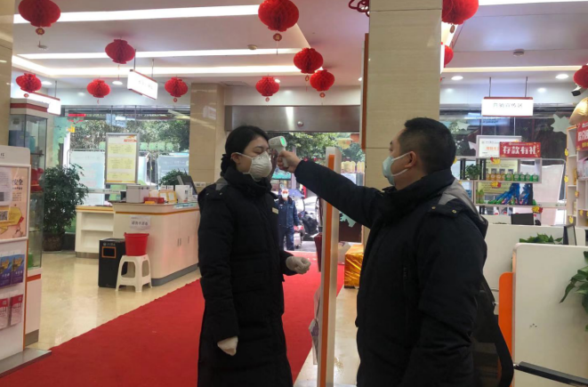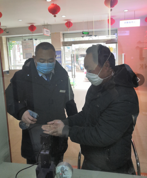 根据疫情防控工作需要,该行在保障基本金融服务和关键基础设施稳定运行的前提下,合理安排营业网点及时间,兼顾自身健康安全。工作人员统一配备口罩、医用酒精、84消毒液、洗手液等安全防护用品以及红外线体温测试仪。在营业网点的显著位置张贴了告示,并提醒客户戴好口罩再进门办理业务。