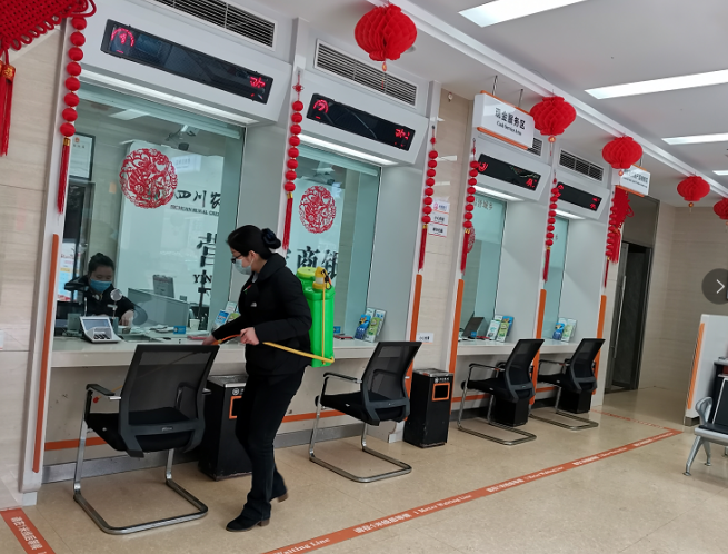 图为该行员工为营业网点做“一日三消毒”工作