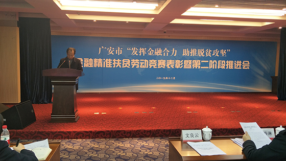 2019年12月18日,在人行广安市中心支行、广安市总工会联合举办的广安市“发挥金融合力 助推脱贫攻坚”金融精准扶贫劳动竞赛表彰暨第二阶段推进会上,广安农商银行获评全市金融精准扶贫劳动竞赛“基础金融服务先进集体”荣誉称号,该行作为金融精准扶贫劳动竞赛先进代表作了交流发言。这是广安农商银行第6次获得扶贫类表彰,体现了社会各界对广安农商银行金融精准扶贫工作的充分肯定,全面展示了四川农信农村金融主力军银行、地方金融主力军银行、普惠金融主力军银行形象。