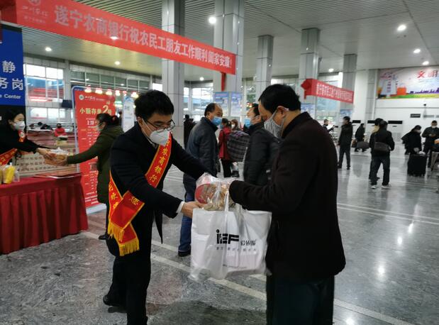 遂宁农商银行工作人员为返程农民工送上防疫物资、方便食品