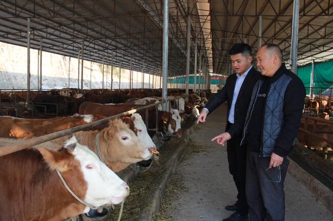开江联社业务部客户经理熊浪(左)到生茂源公司标准化养牛场了解其生产情况 周淼葭 摄