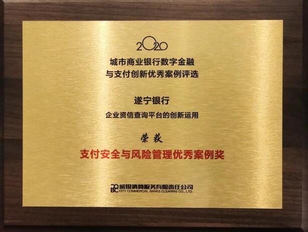 11月26日,2020城市商业银行数字金融与支付创新发展会议在厦门召开,遂宁银行推选的“企业资信查询平台的创新运用”从62家城商行、民营银行共计206个银行案例中脱颖而出,荣膺“支付安全与风险管理优秀案例奖”。