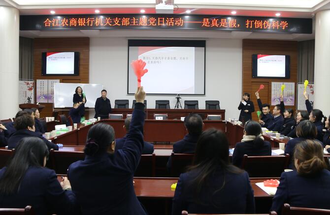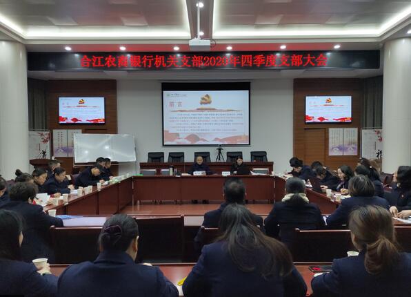 12月23日晚,合江农商银行机关支部召开2020年四季度党员大会,该行机关支部党员、预备党员、发展党员、入党积极分子共36人参加了此次会议。会上该行机关支部书记进行了主题党课《迈向十四五——解读党的十九届五中全会》以及党中央、省联社党委、总行党委相关文件及会议精神的领学,并对吸收预备党员进行了研究表决。会议还特别开展了“是真是假,打倒伪科学”主题党日活动,通过知识抢答的方式有效提高党员干部对伪科学的辨识能力。此次会议在“怎么看”上统一了思想,在“干什么”上凝聚了共识,在“怎么干”上精准了发力,为该行全面贯彻落实党的十九届五中全会精神和创新党组织活动方式打下了坚实的基础。