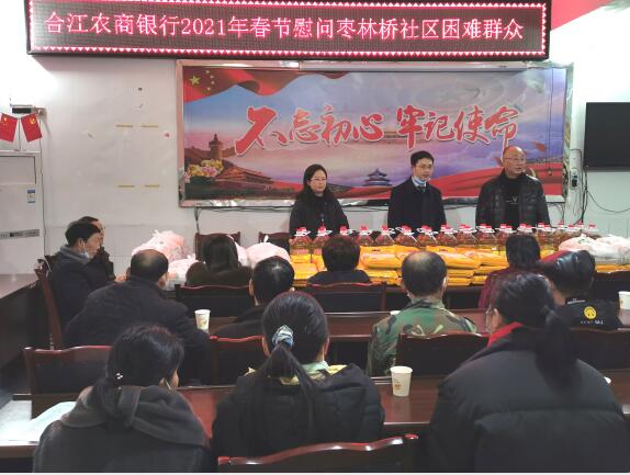 积极开展社会公益活动。营业部支部与枣林桥社区支部一起为社区服务工作者赠送了口罩等防疫物资,为困难群众送去了米、油等生活物资,把温暖送到了每一位困难群众的手中,切实解决贫困群众的生活难题,让困难群众也能过上欢乐、祥和、喜庆的春节。