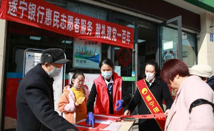 遂宁银行青年志愿服务队现有注册队员190余人,占全行员工的22.27%。2020年以来,在团市委、行党委和各级团组织的关心指导下,队员们大力弘扬“奉献、友爱、互助、进步”的志愿服务精神,主动作为,迎难而上,积极参加了新冠疫情防控、文明城市创建、环保公益宣传、社区助老扶孤、留守儿童关爱、反诈防骗宣传、乡村脱贫攻坚等系列主题青年志愿服务活动,受到了广大群众的普遍好评。