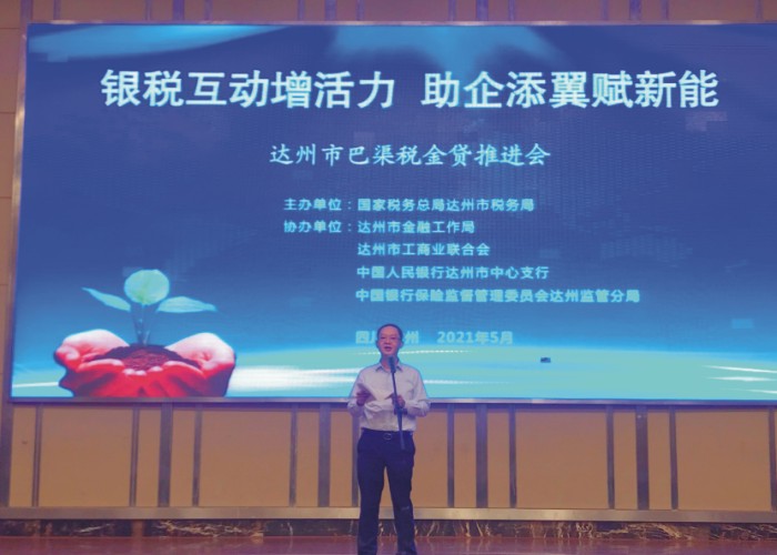 5月26日,在达州市税务局主办,达州市金融工作局、人行达州中心支行、达州银保监分局等协办的达州市“巴渠税金贷”推进会上,作为全市金融机构代表,达州农商银行党委副书记、行长胡泰峰作交流发言,交流该行推进“蜀信•税金贷”银税互动金融服务的成效和经验。