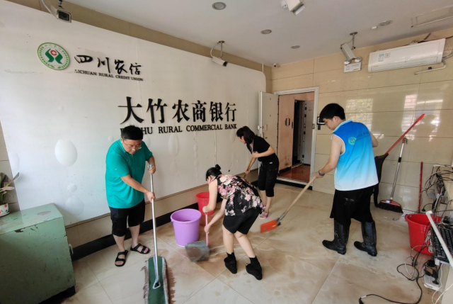 8月8日,大竹县气象局发布暴雨红色预警,大竹县域普降特大暴雨,暴雨引发的洪水造成多个乡镇出现严重内涝,街道大面积进水,大竹农商银行部分网点也在本次暴雨中受灾,被迫暂停营业,个别网点营业场所进水,泥沙淤积,严重影响员工正常工作生活和网点恢复营业。为确保网点尽快恢复营业,保障员工基本生活需要,大竹农商银行组织干部员工奔赴受灾网点,协助网点员工开展抢险排淤、清洁消杀、设备检修等工作,与时间赛跑,尽可能将灾害造成的损失降到最低。