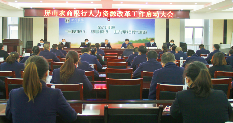 2021年11月29日,屏山农商银行召开人力资源改革工作启动大会。省联社宜宾办事处党委书记王忠、综合科及业务科科长李绪林、屏山农商银行班子成员、全体中干、部分员工代表参加了本次启动大会。