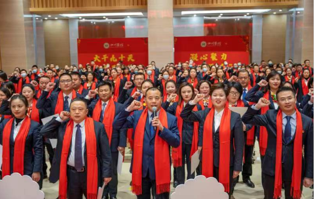 扛起战旗剑出鞘,龙腾虎跃开门红!12月28日,为深入贯彻落实四川农信2022年“开门红”工作视频会精神,对“开门红”工作再动员、再部署,什邡农商银行召开2022年“开门红”誓师大会。总行领导班子、中层干部、中干助理、本部员工代表、客户经理、会计主管、门市负责人、大堂经理共165人参会。