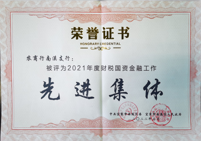 宜宾农商银行南溪支行荣获2021年度财税国资金融工作先进集体