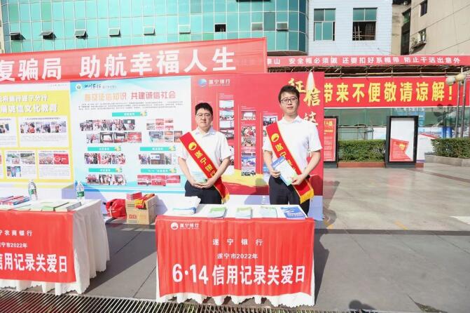 6月14日,在中国人民银行遂宁市中心支行组织领导下,遂宁银行前往船山区裕丰园广场开展了2022年度“6.14信用记录关爱日”征信宣传活动。活动现场,遂宁银行在展示近五年来征信成果的同时,还通过发放信用宣传手册、讲解征信知识、宣传“征信修复”的危害性、推广“低碳有我,诚信同行”线上答题活动等,让公众了解征信的重要性,通过线上有奖问答的形式引导社会公众学征信、懂征信、讲诚信,同时激励广大征信从业者进一步践行征信为民的初心使命,助力企业纾困解难、促进社会融资发展,为党的二十大顺利召开贡献征信力量。