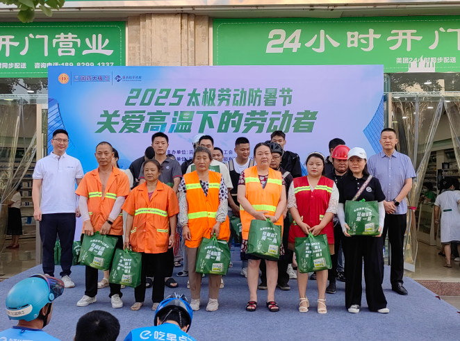 2025年6月10日上午,一场洋溢着温情与关怀的“关爱高温下的劳动者”活动在圣高广场和平药房暖心开场。此次活动由资阳市雁江区总工会主办,和平药房资阳连锁有限责任公司承办,重庆太极实业(集团)股份有限公司协办,旨在为在高温下坚守一线的户外劳动者送上防暑降温福利,提升他们的幸福感和归属感,同时普及防暑知识,增强他们的高温防护意识。