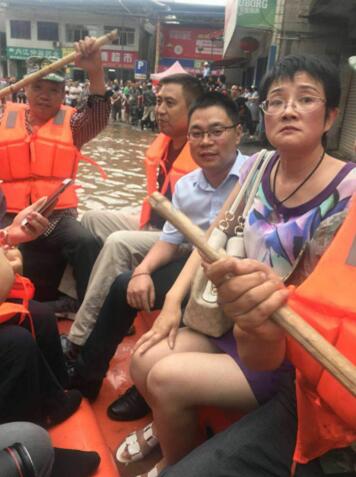 7月12日中午,受灾情况最严重的鱼溪信用社,洪水已经淹没了整条街道,信用社营业室水位已到达1.5米深,从一楼到二楼的通道被封。此时停水停电,仅有的一点干粮也吃完,而经过一天的忙碌和值守,大家都有一些疲惫和饥饿。就在此时,一条小船慢慢地朝信用社划过来,原来一位路过信用社的同事主动为大家送来了盒饭。下午水位越涨越高,大有要漫上二楼的趋势,此时,一个同事电话响起,援兵到了。原来,附近信用社的同事都在关注着鱼溪信用社的灾情,金带、高楼、铁佛、金李井等兄弟信用社都自发组织人员前来支援。他们涉水翻墙进入信用社,扛起麻袋,抱起机器设备就往楼上搬,同时,水南信用社主任谭忠德,板栗社主任杨茂春在得知抢险人员手机因停电无法充电,部分无法联系后,主动收集了10余个充电宝,购买发电器材送到抢险救灾现场。