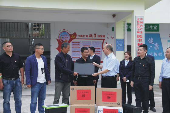继捐资30万元援建对口石子镇民主村村委办公楼后,近日,大竹农商银行董事长李太勇带领帮扶团队一行14人来到石子镇民主村,向该村捐赠价值15000元的全新电脑、打印机等设备。