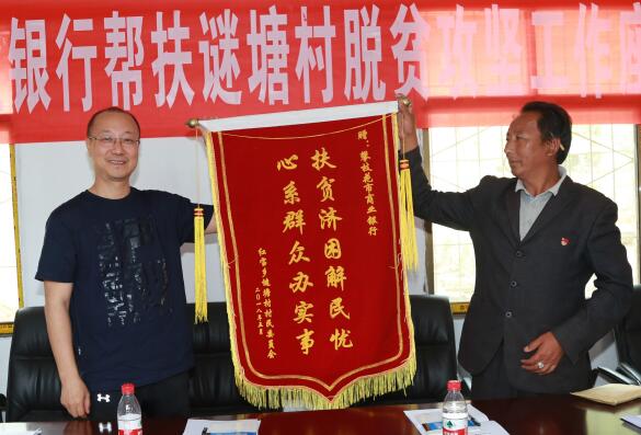 攀枝花市商业银行党组书记、董事长杨宗林(左)接受结对扶贫乡赠送锦旗