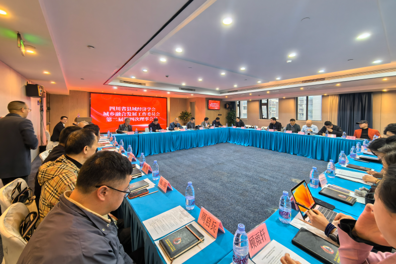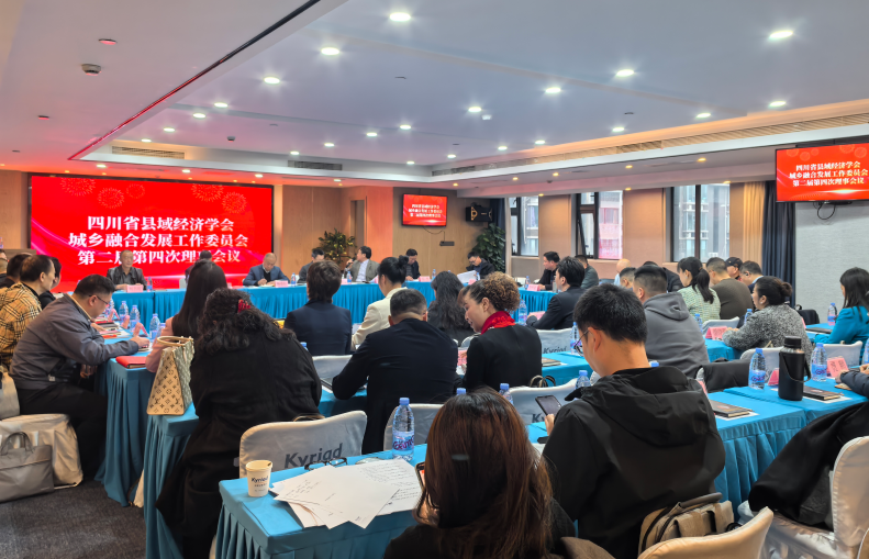 2 月 28 日,学会城乡融合发展工作委员会(下称“城乡融合委”)第二届第四次理事会在成都召开。会议以“深化城乡融合、赋能县域发展”为主题,省商务厅原一级巡视员、学会城乡融合委理事长杨春轩主持会议。国家审计署驻成都原副特派员甄广川,省发展改革委一级调研员杨书明、省发展改革委工程咨询院原处长岳勇等特聘专家到场指导并为城乡融合委揭牌。城乡融合委秘书长马龙政,执行秘书长李香贵、孙亚西,城乡融合委理事单位代表,以及政府、学界、企业代表、城乡融合委特聘专家共 50 余人参加会议。